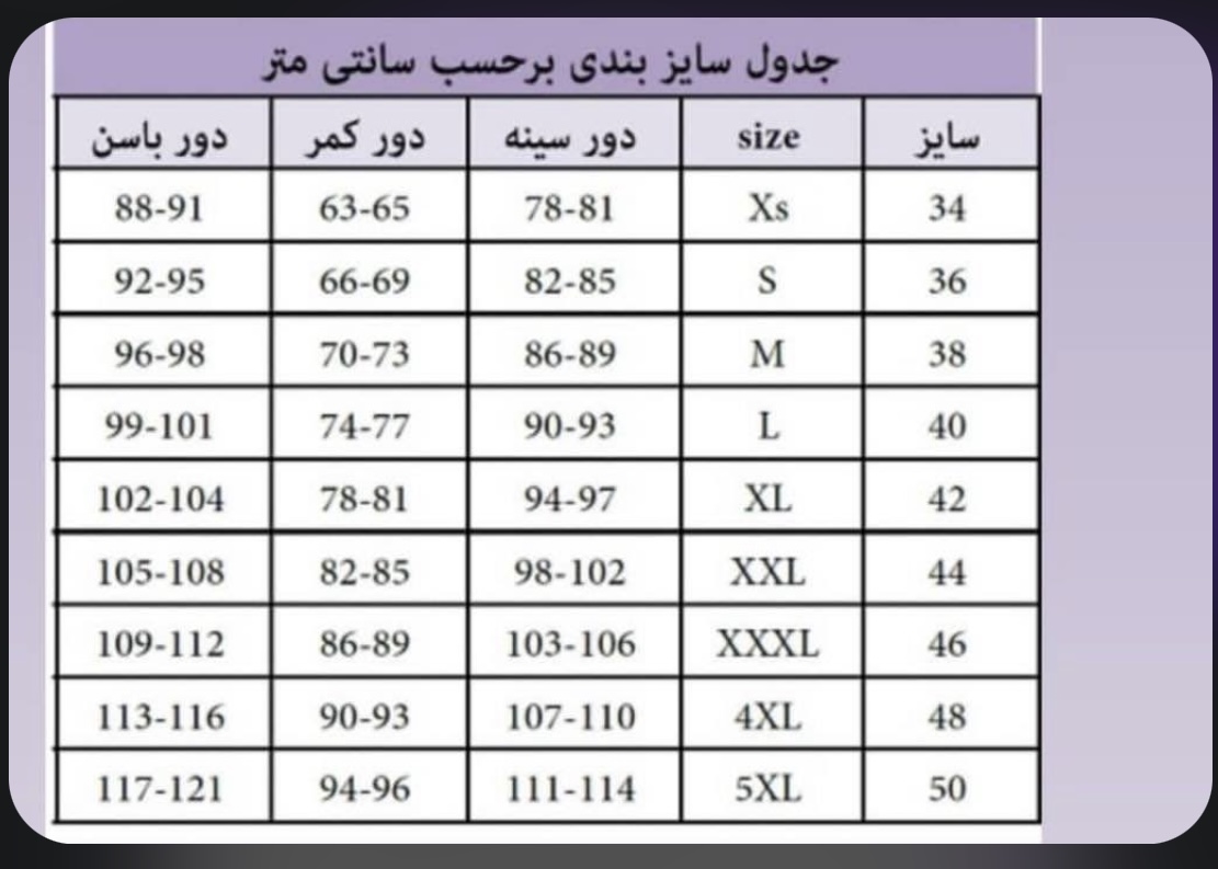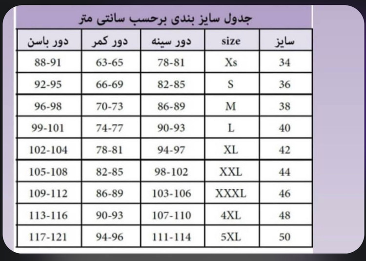 سه ایکس لارج:/دورکمر۷۶ /دورسینه۹۴ /قد۵۶